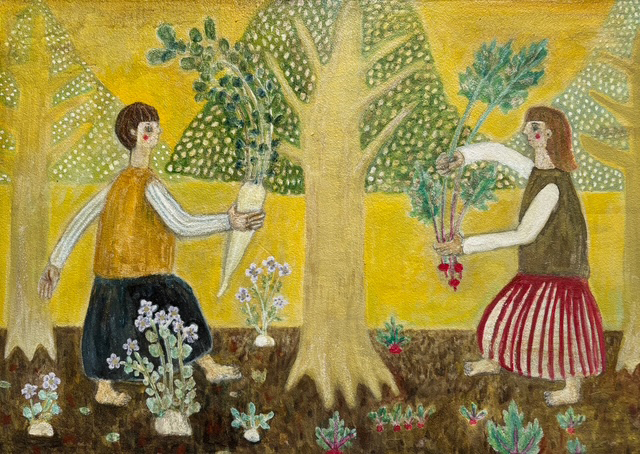 二人の女の子が「自分の育てた野菜はいかが?」とスキップしながら向かい合っている。